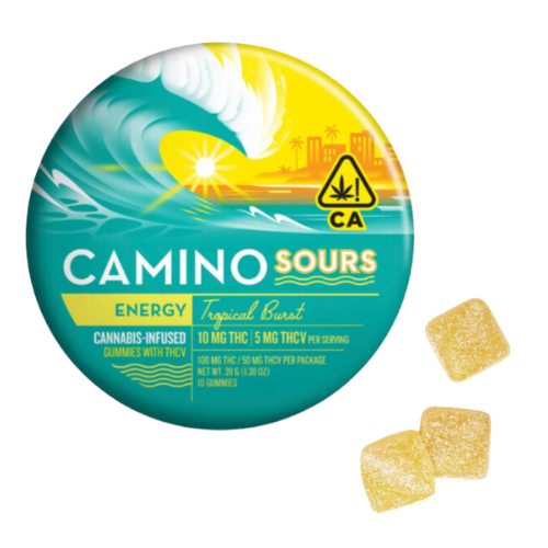 Enjoy the exotic taste of Tropical Burst with Camino Kiva's 100mg 10pk Sours Gummies, offering a unique blend of cannabinoids for an energizing experience.