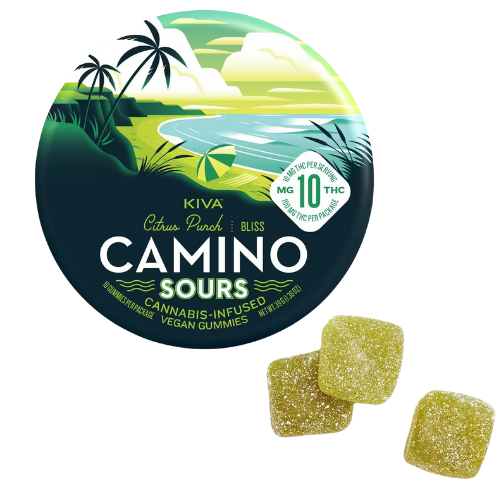 Delight in the refreshing taste of Citrus Punch with Camino Kiva's 100mg 10pk Sours Gummies, offering a flavorful and uplifting experience.