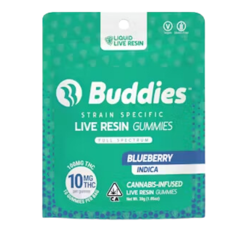 Opt for Buddies' Blueberry 100mg LR Gummies for a delicious and convenient way to enjoy the relaxing and happy effects of THC, combined with the juicy taste of blueberries.