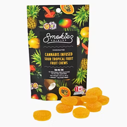 Dive into the exotic flavors of Tropical Fruit with Smokiez's 100mg Sour Gummies. These gummies offer a burst of tropical goodness in every bite.