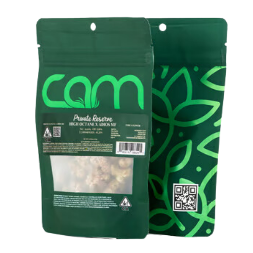 Experience the powerful synergy of High Octane x Adios MF, a 7g flower from CAM Flower, designed for the ultimate cannabis connoisseur seeking intensity and complexity.