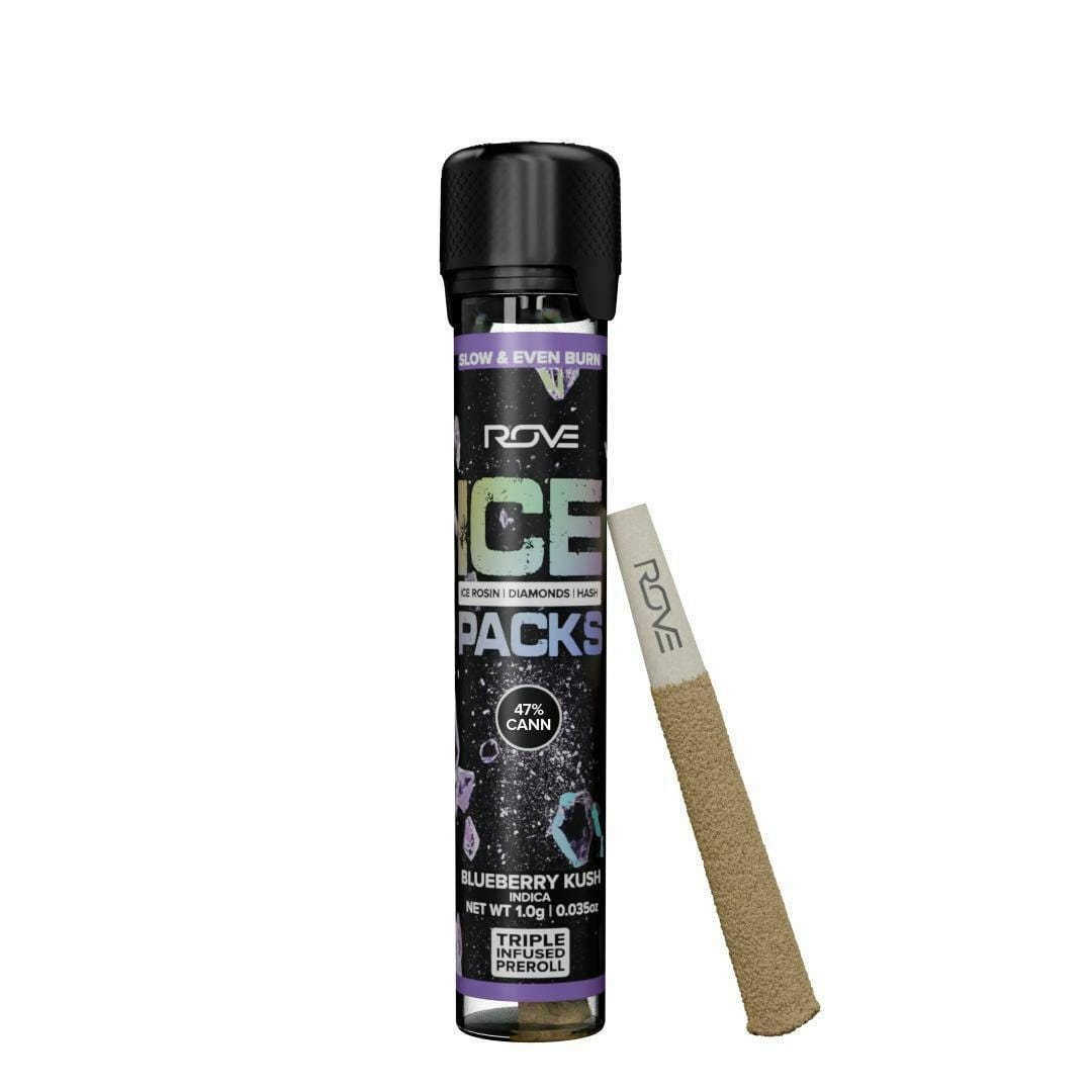 Rove 1G Ice Pack Preroll, the world’s first triple-infused preroll. Made with premium-grade flower fully-infused with THCA diamonds and solventless ice hash rosin, expertly rolled and coated in more ice hash. Super smooth and ultra potent, Rove Ice Packs test up to 50% THC. Welcome to the next evolution of prerolls.