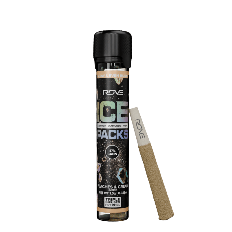 Rove 1G Ice Pack Preroll, the world’s first triple-infused preroll. Made with premium-grade flower fully-infused with THCA diamonds and solventless ice hash rosin, expertly rolled and coated in more ice hash. Super smooth and ultra potent, Rove Ice Packs test up to 50% THC. Welcome to the next evolution of prerolls.