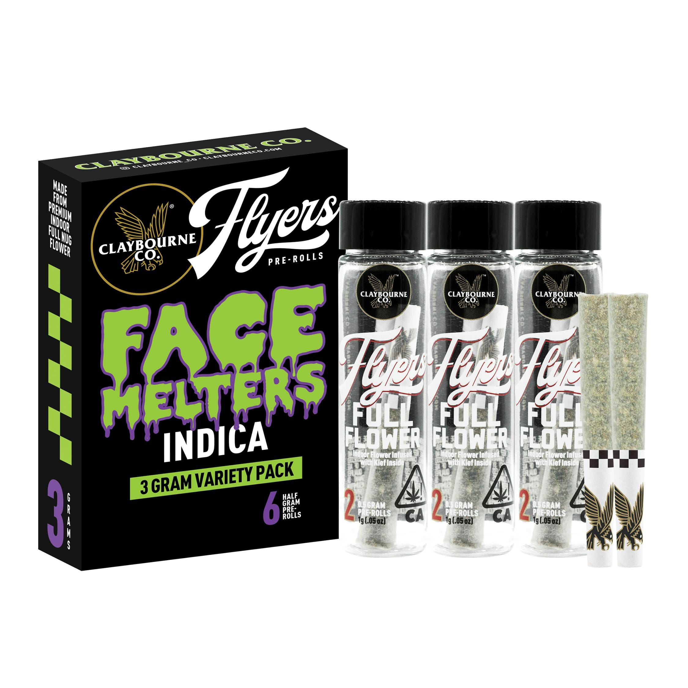 Catch a face melting fade with a Flyers Face Melters Flight Pack. This indica flight includes three (3) different strains in a box and two (2) half gram pre-polls for every strain, made from premium indoor full nug flower. Try a variety of three different body melting indica strains.