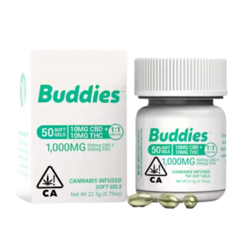 Opt for Buddies' 1:1 50ct Capsules for their balanced THC to CBD ratio, providing enhanced therapeutic effects and promoting overall well-being.