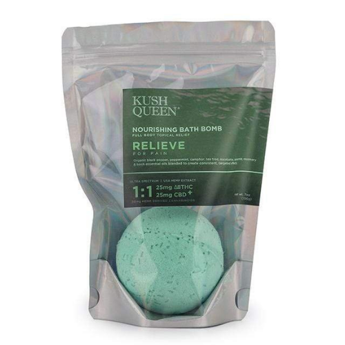 Soothe your body and mind with the Relieve 1:1 bath bomb from Kush Queen, offering balanced CBD and THC for maximum comfort.