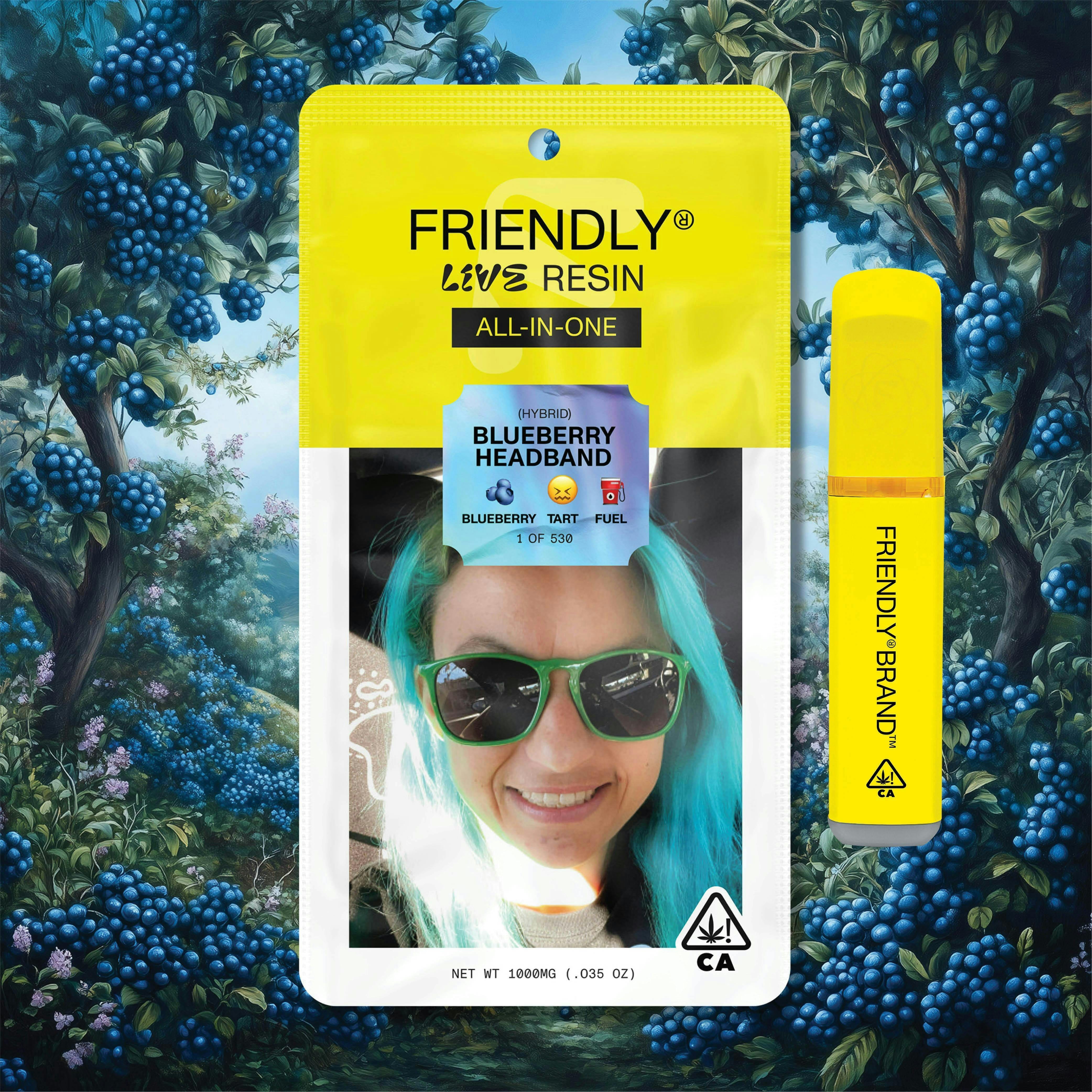 Blueberry Headband AIO Friendly Brand Vape - 1 Gram is a vape cart by Friendly Brands (1g). Available for pickup and delivery at Atrium dispensary in Los Angeles.
