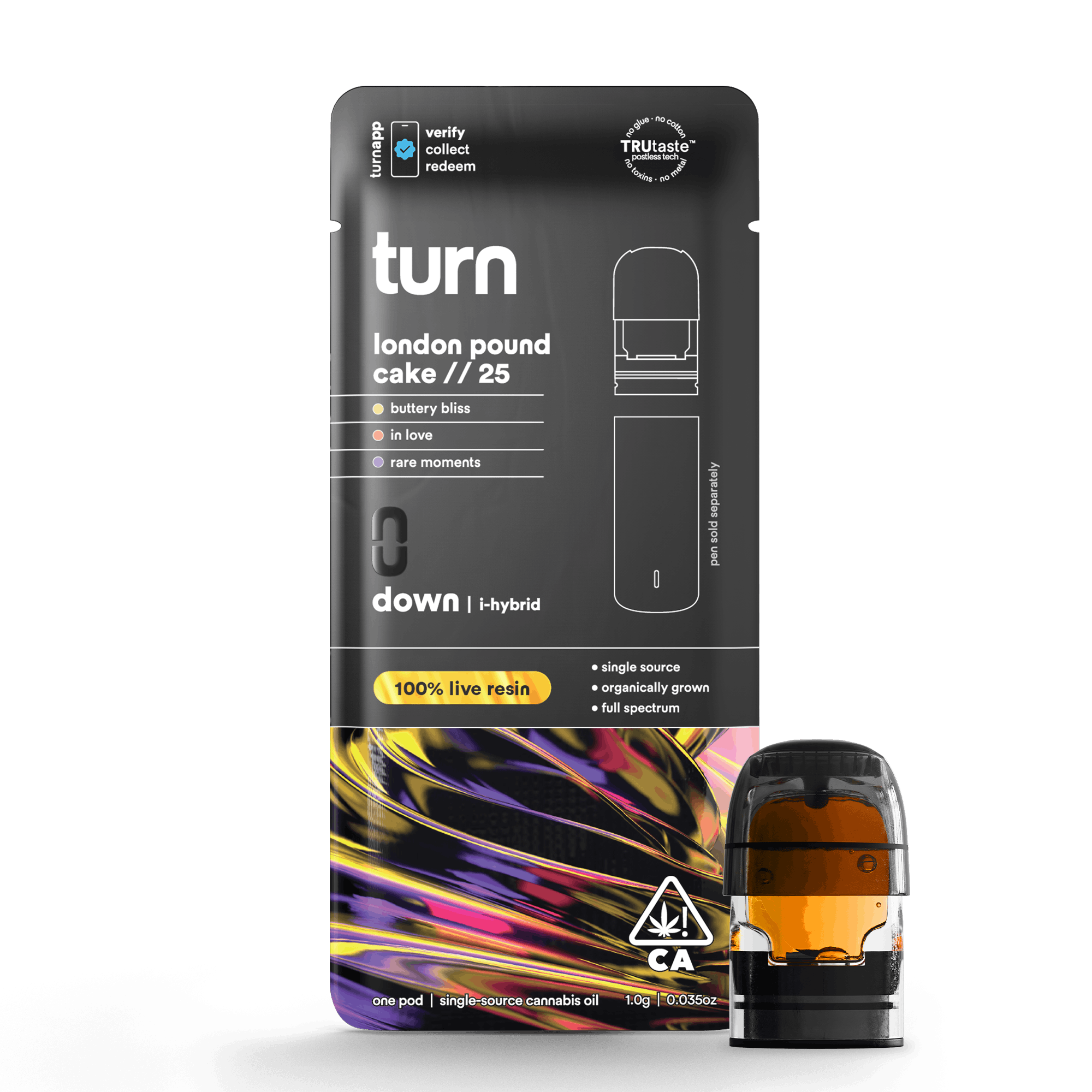 London Pound Cake LLR Turn Pod Vape - 1 Gram is a vape cart by Turn Vapes (1g). Available for pickup and delivery at Atrium dispensary in Los Angeles.