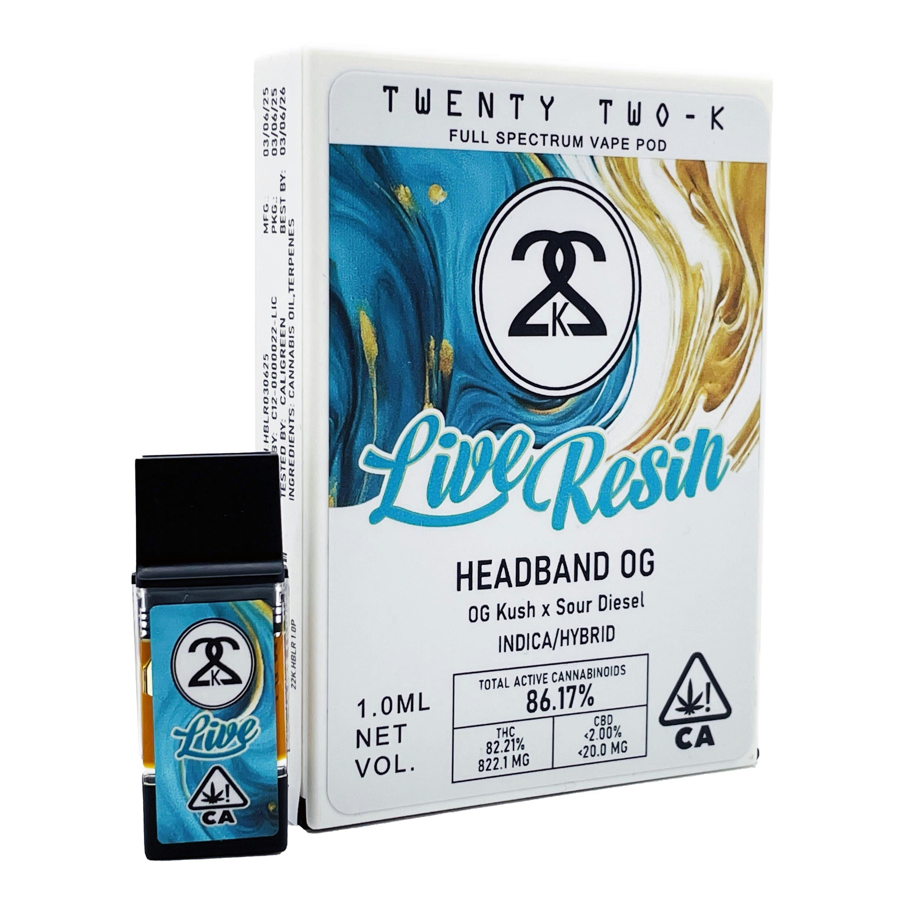 Headband OG LR Pod Vape - 1 Gram is a vape cart by 22K (1g). Available for pickup and delivery at Atrium dispensary in Los Angeles.