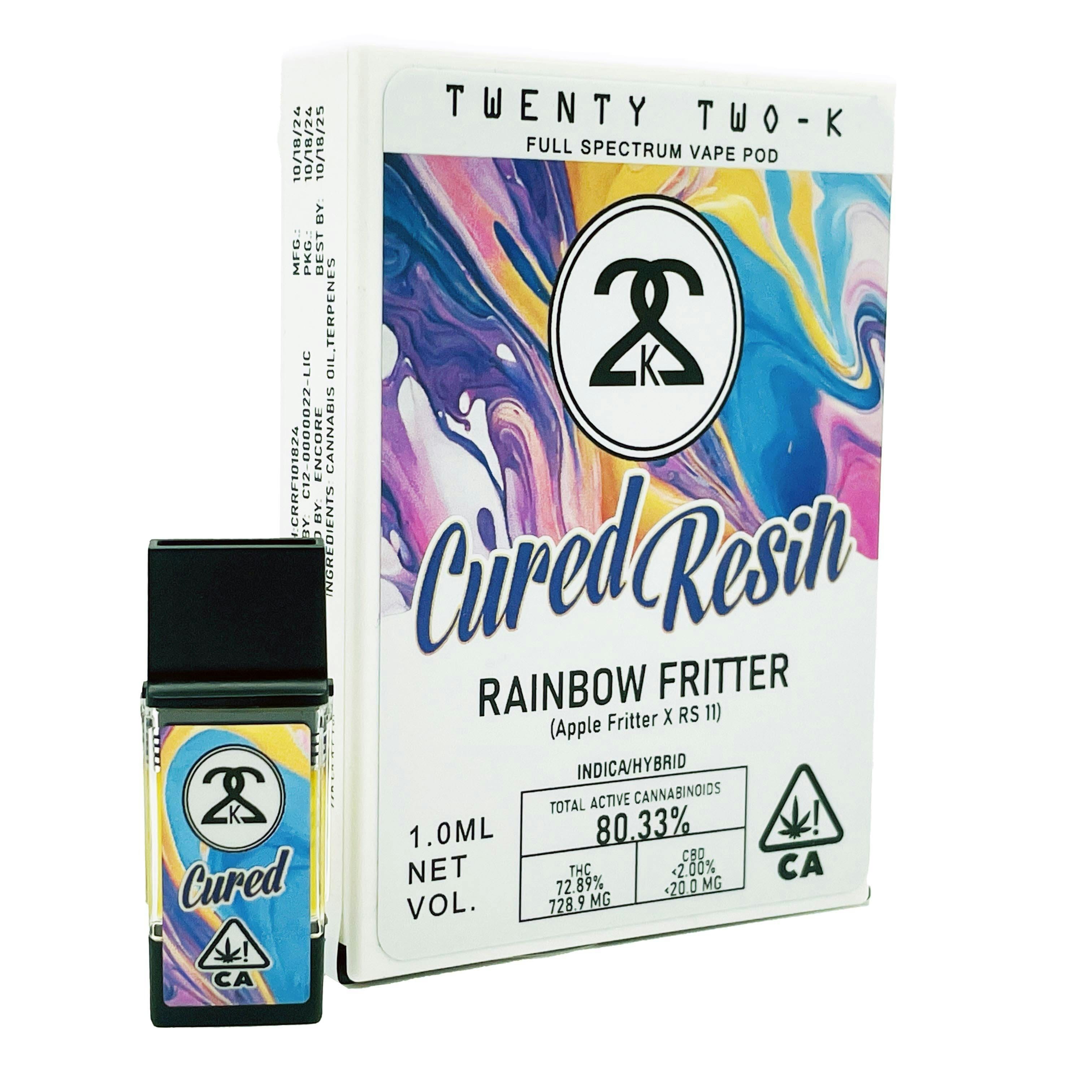 Rainbow Fritter Cured Pod Vape - 1 Gram is a vape cart by 22K (1g). Available for pickup and delivery at Atrium dispensary in Los Angeles.
