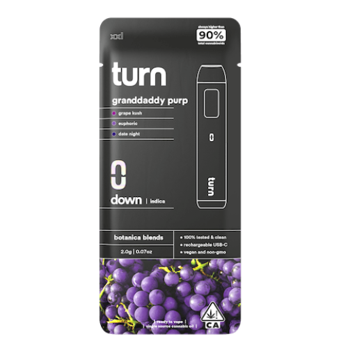 Turn's 2g Disposable Vape in Grandaddy Purple offers a premier cannabis experience for those seeking a potent and flavorful high. Each device contains 2 grams of premium cannabis oil, celebrated for its purity, potency, and delightful flavor profile. The Grandaddy Purple flavor is renowned for its rich, grape-like taste with earthy undertones, providing a luxurious and smooth vaping experience.