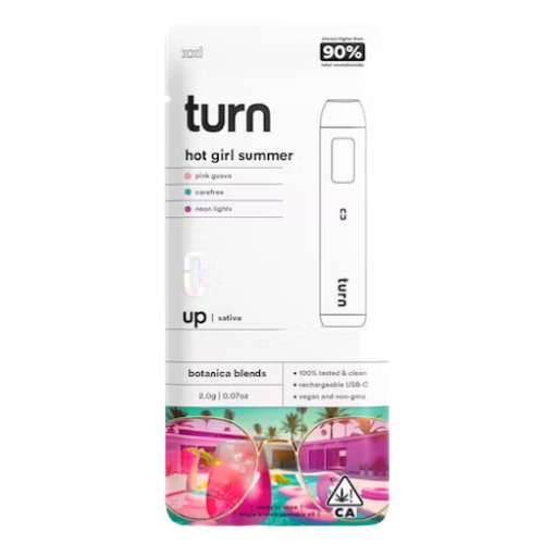 Turn's 2g Disposable Vape in Hot Girl Summer offers a premier cannabis experience for those seeking a potent and flavorful high. Each device contains 2 grams of premium cannabis oil, celebrated for its purity, potency, and delightful flavor profile. The Hot Girl Summer flavor is renowned for its vibrant, tropical taste with a blend of sweet fruits and a hint of floral notes, providing a refreshing and smooth vaping experience perfect for summer vibes.