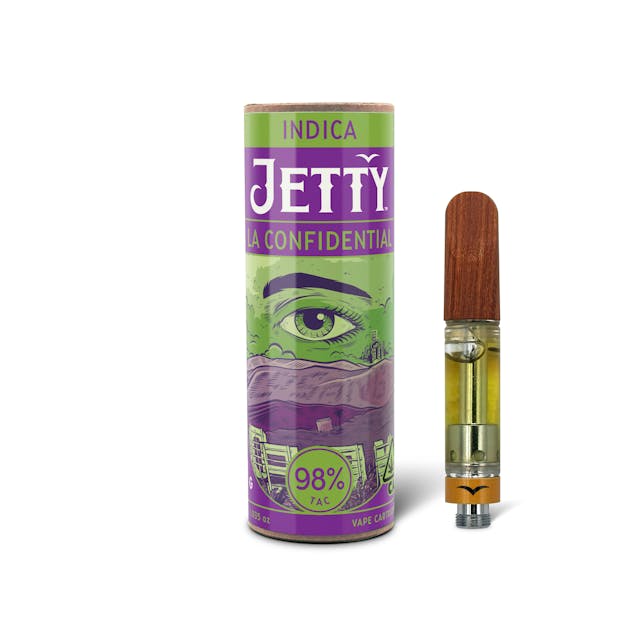 Unwind with the potent and mysterious L.A. Confidential, offered in a 1g Indica Vape by Jetty, delivering a sedative high that's perfect for relaxation and therapeutic use.