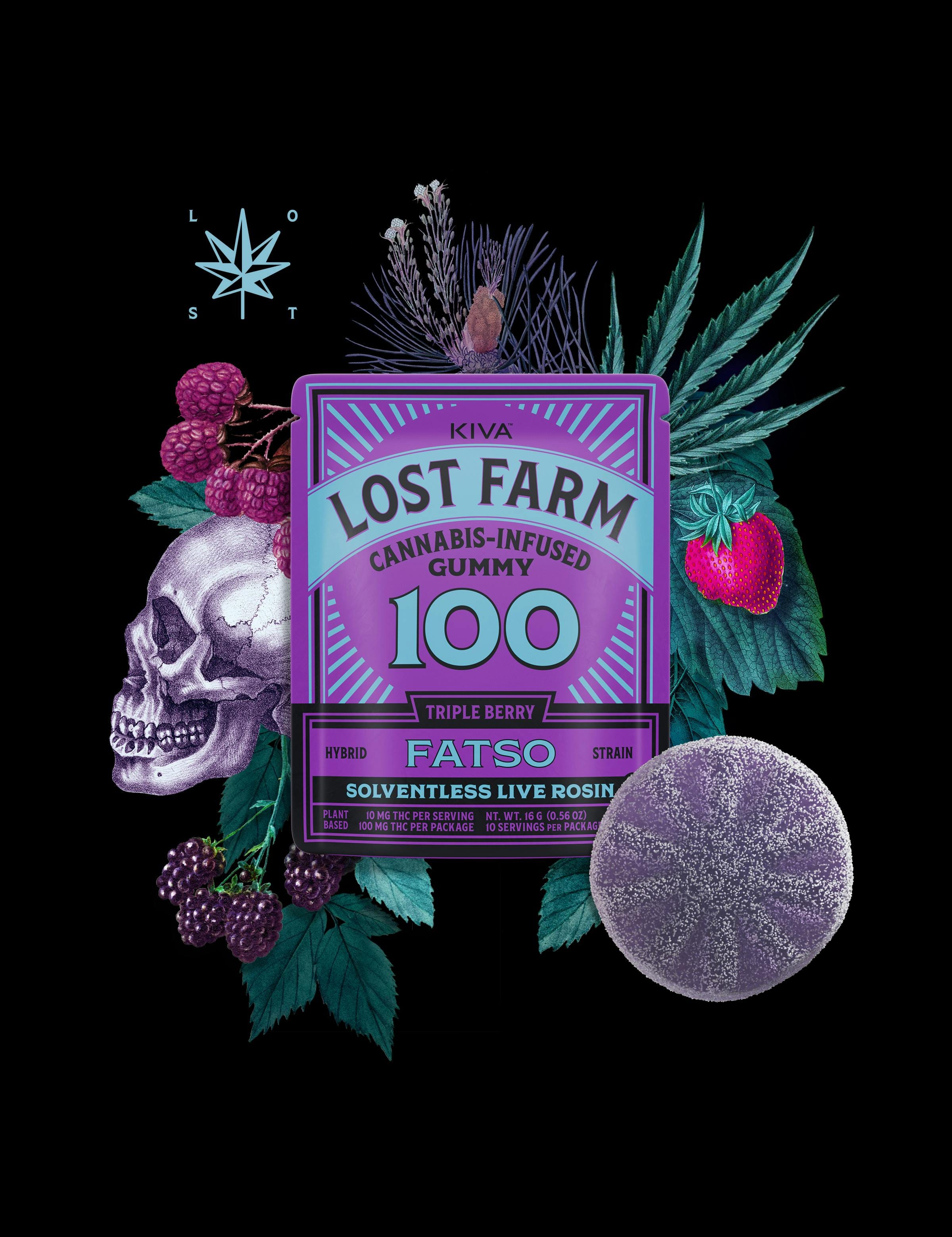 Fatso Triple Berry Single Lost Farm Gummy - 100 mg is a edible by Kiva (100mg). Available for pickup and delivery at Atrium dispensary in Los Angeles.