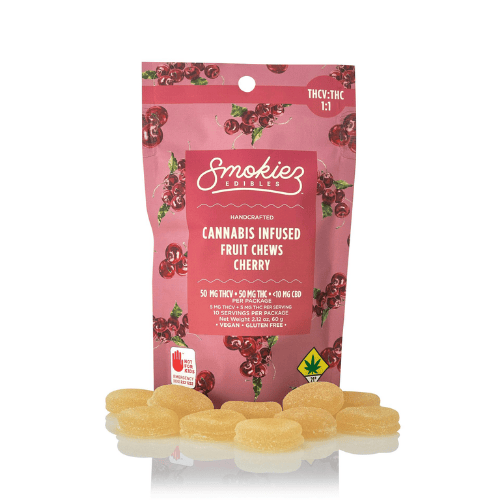 Cherry 2:1 THC:THCV Gummies - 150 mg is a edible by Smokiez (100mg). Available for pickup and delivery at Atrium dispensary in Los Angeles.