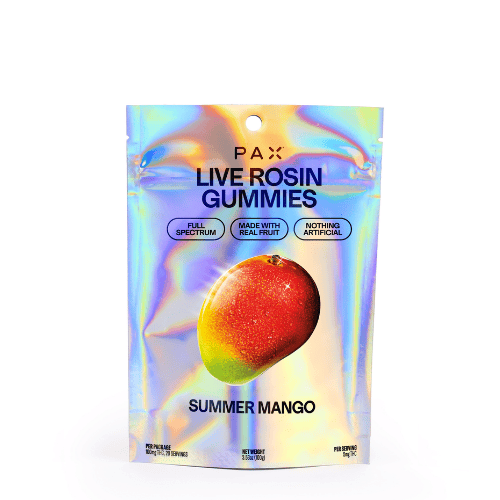 Summer Mango Live Rosin Gummies - 100 mg is a edible by PAX (100mg). Available for pickup and delivery at Atrium dispensary in Los Angeles.