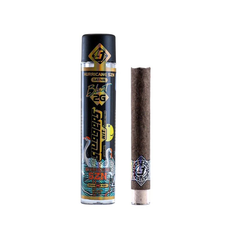 Sluggers presents a 2g Blunt filled with premium flower, rosin, and diamonds, all wrapped in a hemp leaf and tipped with a corn husk filter, providing a gassy and creamy acidic experience.